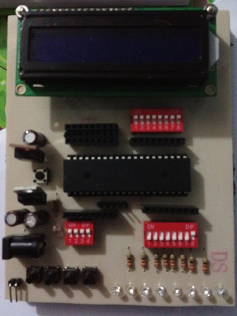 Sebelum masuk materi berikutnya, ada baiknya kamu membaca datasheet Microcontroller Atmega xx (sekian) di web Atmel nya karena dalam rubrik ini akan langsung masuk materi praktek membuat sistem minimum, atau kamu bisa membacanya di http://forum.elins.org/robotika/belajar-micro-controller-yuk!/. Selanjutnya kita mulai membuat sistem minimum dari uC. Mengapa uC memerlukan sistem minimum untuk beroperasi. Coba kita bayangkan layaknya prosesor di Komputer /CPU/Laptop. Kalo hanya ada prosesor di dalam CPU mana mungkin bisa beroperasi tanpa RAM, VGA, Harddisk, dll. Sama seperti uC , jadi diperlukan perangkat pendukung agar uC bisa beroperasi, dalam board sistem minimum bisa dijadikan sebagai trainer kit untuk fasilitator pembelajaran microcontroller. Pada sistem minimum bisa ditambahkan dengan button sebagai input, led sebagai keluaran atau output, lcd text sebagai penampil  text, dan juga bisa ditambahkan sensor seperti sensor suhu (LM35), sensor ultrasonik (SRF-05), dan lain-lain.  Berikut contoh dari sistem minimim yg telah dijadikan sebagai trainer kit: